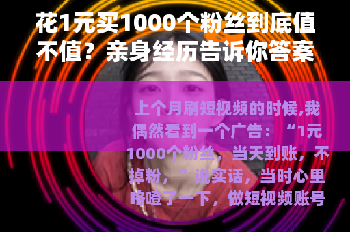 上个月刷短视频的时候,我偶然看到一个广告:“1元1000个粉丝,当天到账,不掉粉。”说实话,当时心里咯噔了一下,做短视频账号快半年了,粉丝才三百多个,每次发作品点赞不过两位数,看到别人动辄几万粉,说不动心是假的,1块钱,连瓶水都买不到,却能换来一千个粉丝,这诱惑实在有点大。