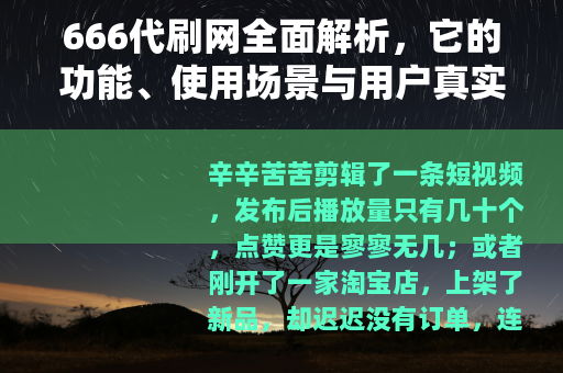 辛辛苦苦剪辑了一条短视频,发布后播放量只有几十个,点赞更是寥寥无几;或者刚开了一家淘宝店,上架了新品,却迟迟没有订单,连个访客都没有,在社交媒体和电商平台的竞争越来越激烈的今天,数据几乎成了衡量内容质量、产品受欢迎程度的“硬通货”,一个名为“666代刷网”的平台进入了大众视野,它号称能够提供快手、抖音、微博、微信等平台的数据提升服务,包括粉丝、播放量、点赞、评论、转发等,666代刷网到底靠不靠谱?它是如何运作的?普通人使用它又有哪些需要注意的地方?今天我就结合自己的实际操作和多方了解,把这件事掰开揉碎了讲清楚。