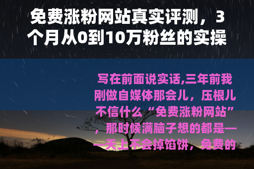 说实话,三年前我刚做自媒体那会儿,压根儿不信什么“免费涨粉网站”,那时候满脑子想的都是——天上不会掉馅饼,免费的肯定没好货,直到有一次在知乎上看到一个同行分享,说自己靠某免费工具一个月涨了2万粉,评论区吵翻了天,有人骂他是托,有人追着要链接,我抱着试试看的心态点进去,结果这一试,就是整整三个月。