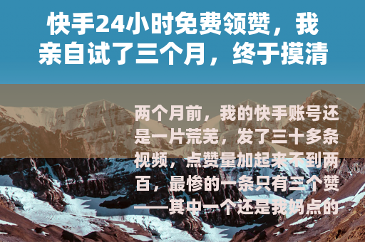 两个月前,我的快手账号还是一片荒芜,发了三十多条视频,点赞量加起来不到两百,最惨的一条只有三个赞——其中一个还是我妈点的,那时候我每天都在研究“24小时快手免费领赞”到底靠不靠谱,网上翻来翻去都是广告,要么让你加微信,要么让你下载来路不明的软件,我试着点了几个,结果手机差点中毒,通讯录被疯狂骚扰。