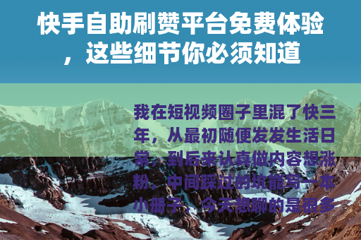 我在短视频圈子里混了快三年,从最初随便发发生活日常,到后来认真做内容想涨粉,中间踩过的坑能写一本小册子,今天想聊的是很多人问过我的事——那些号称“快手自助刷赞平台免费”的网站,到底能不能用?我用过几个,也见过朋友用过,把真实情况掰开揉碎说给你听。