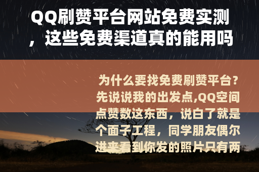 这篇东西写下来,算是我这两周的实测记录,那些“QQ刷赞平台网站免费”的搜索结果里,十个有九个都藏着各种各样的坑,如果你真的想给空间增加点热度,不妨先试试互赞群或者自己多更新有趣的内容,如果非得用平台,记住一条原则:任何要你QQ密码、要你手机号、要你加陌生人微信的网站,一律关掉,那些所谓的“免费”背后,往往是你付出的更多——可能是时间、隐私,甚至账号安全。