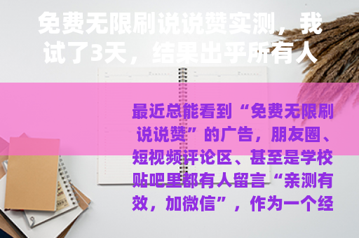 最近总能看到“免费无限刷说说赞”的广告,朋友圈、短视频评论区、甚至是学校贴吧里都有人留言“亲测有效,加微信”,作为一个经常发说说但点赞寥寥的普通人,我实在忍不住好奇:这东西到底能不能用?真的免费?无限?抱着试一试的心态,我花三天时间,把市面上能找到的几个所谓“免费无限刷赞”渠道全试了一遍,结果比我想象的复杂得多。