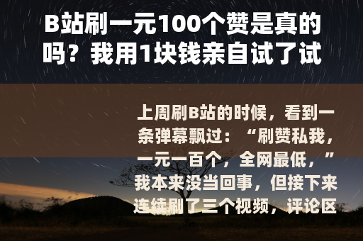 上周刷B站的时候,看到一条弹幕飘过:“刷赞私我,一元一百个,全网最低。”我本来没当回事,但接下来连续刷了三个视频,评论区都有人留类似的话,好奇心起来了——一元一百个赞,这价格比买瓶水还便宜,到底能不能兑现?我决定掏一块钱,当个实验品,看看这个过程到底怎么走。