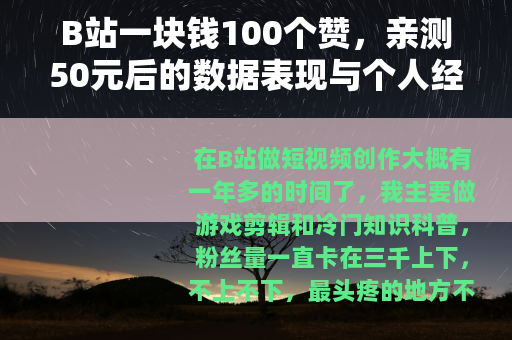 在B站做短视频创作大概有一年多的时间了,我主要做游戏剪辑和冷门知识科普,粉丝量一直卡在三千上下,不上不下,最头疼的地方不是内容质量——毕竟我的视频在同类题材里播放量偶尔能冲到十万,但点赞数常常只有两三百,显得特别寒碜,很多朋友劝我去买点赞,说“一块钱100个赞”这种服务在B站早就公开叫卖了,不少大UP主早期也靠这个起量,我犹豫了很久,一方面是担心平台会惩罚,另一方面也好奇:花几十块钱买来的赞,到底能带来什么?会不会只是心理安慰?