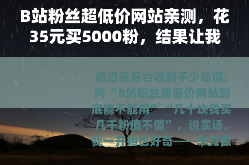 最近在后台收到不少私信,问“B站粉丝超低价网站到底能不能用”“几十块钱买几千粉值不值”,说实话,我一开始也好奇——毕竟做B站账号快一年了,播放量上不去,粉丝数卡在500出头,看到那些号称“全网最低价”“秒到5000粉”的广告,谁心里不痒一下?于是我花了两周时间,从搜索、下单到体验全流程走了一遍,今天把真实过程写出来,给各位做个参考,别跟我提什么“内幕”“解密”,我就一个普通UP主,用自己的账号试了一回,结果嘛……往下看。