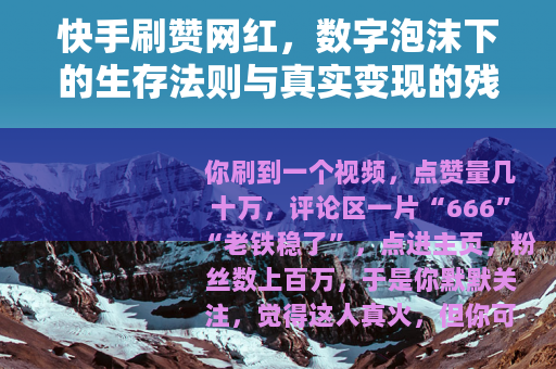 刷赞网红的故事,本质上是一个关于“虚荣”的故事,我们每个人都有一种原始冲动——希望被看见,希望被认可,希望比别人强,在现实世界里,这种冲动需要付出巨大努力去实现,但在快手这种虚拟舞台上,只要你愿意花钱,瞬间就能拥有百万赞,瞬间就能享受被围观的感觉,这种低成本的高潮,让无数人沉迷。