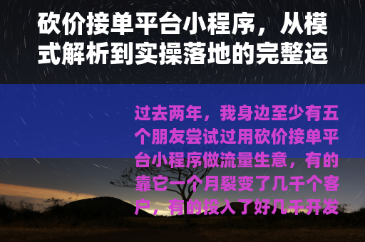这篇文章,我不打算跟你讲空洞的理论,而是把我自己测试过、复盘过、甚至踩过坑的经验拆开揉碎,从模式、开发、运营到盈利,一条一条说清楚,如果你正在考虑做一个砍价接单类的小程序,或者已经上线了但数据起不来,这篇内容应该能帮你省下不少试错成本。