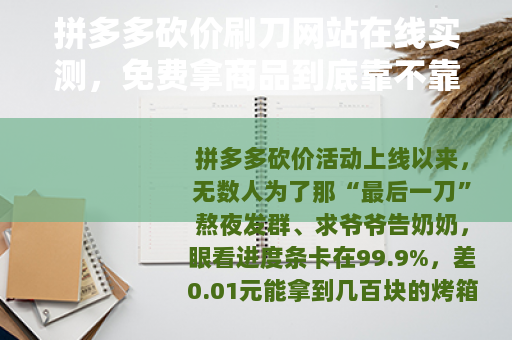 拼多多砍价活动上线以来,无数人为了那“最后一刀”熬夜发群、求爷爷告奶奶,眼看进度条卡在99.9%,差0.01元能拿到几百块的烤箱、电饭煲甚至手机,这时候“拼多多砍价刷刀网站在线”这类服务应运而生,我身边不少朋友用过,自己也试过几个,今天就把真实的体验、操作流程、以及那些网站到底怎么运作的,掰开了说清楚,文章有点长,但每一条都是真金白银换来的经验。