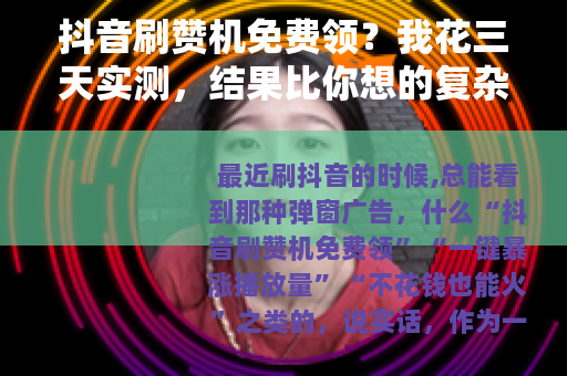 最近刷抖音的时候,总能看到那种弹窗广告,什么“抖音刷赞机免费领”“一键暴涨播放量”“不花钱也能火”之类的,说实话,作为一个运营了小半年、粉丝刚过一千的业余创作者,我每次看到这种广告都忍不住点一下——毕竟谁不想让自己的视频多点赞呢?上周我终于没忍住,跟着一个链接点进去,领了一台所谓的“抖音刷赞机”,本来以为捡到宝了,结果三天折腾下来,我发现自己掉进了一个比表面看起来复杂得多的坑里,今天就把整个过程原原本本写出来,给想走这条路的兄弟们提个醒。