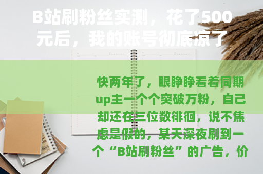 先说结论:B站刷粉丝这件事,不是“有用没用”的问题,而是“怎么死”的问题,我花了500元试了三种最常见的刷粉方式,最终账号权重暴跌,推荐量从日均上千掉到个位数,甚至被系统直接标记为“低质量账号”,如果你想长期做下去,请一定看完这篇文章。