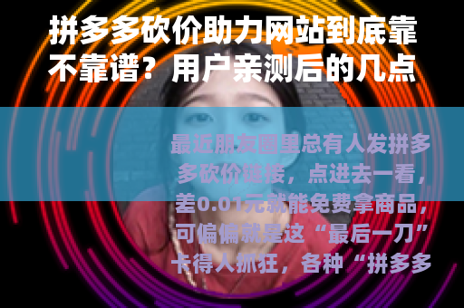 最近朋友圈里总有人发拼多多砍价链接,点进去一看,差0.01元就能免费拿商品,可偏偏就是这“最后一刀”卡得人抓狂,各种“拼多多砍价助力网站”开始冒出来,宣称花几块钱就能找“真人助力”帮你砍成,我是那种喜欢自己琢磨的人,前后试了三四家不同的助砍网站,今天把真实体验写下来,希望给大家一点参考。