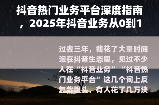 过去三年,我花了大量时间泡在抖音生态里,见过不少人在“抖音业务”“抖音热门业务平台”这几个词上反复栽跟头,有人花了几万块买课程,有人砸钱投了本地推结果连ROI都没算清楚,还有人跟风做了团购达人结果一个月就放弃了,其实问题不在于抖音本身难做,而在于大多数人根本没搞清楚“热门业务平台”到底指的是什么,以及自己应该站在哪个环节切入。