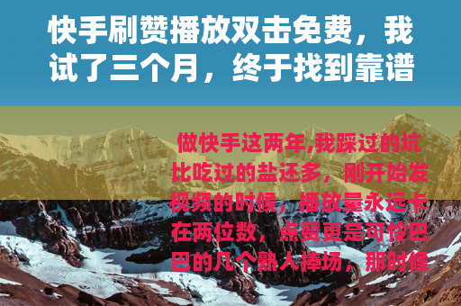 做快手这两年,我踩过的坑比吃过的盐还多,刚开始发视频的时候,播放量永远卡在两位数,点赞更是可怜巴巴的几个熟人捧场,那时候我天天刷到各种“免费刷赞刷播放”的广告,心里痒痒的,又怕被骗钱,后来实在熬不住了,决定亲自试一试那些号称“快手刷赞播放双击免费”的平台和工具,这一试,就是三个月,中间有惊喜也有教训,今天全部掏心窝子讲给你听。