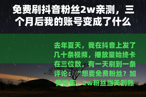 去年夏天,我在抖音上发了几十条视频,播放量始终卡在三位数,有一天刷到一条评论:“想要免费粉丝?加我微信,2w粉丝当天到账。”说实话,那时候我挺心动的,毕竟谁不想试试呢?反正不用花钱,但我还是犹豫了几天,最后决定——拿自己的号做个实验,这篇文章就是那三个月里我踩过的坑、看到的东西,以及最后账号的真实变化,如果你也在琢磨“免费刷抖音粉丝2w”这件事,希望我的经历能让你少走一点弯路。
