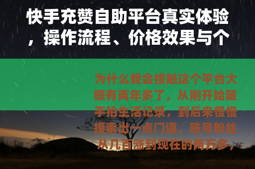 这种落差感我经历过太多次,后来在一个同行的交流群里,有人提到快手充赞自助平台这个东西,当时我第一反应是怀疑——会不会对账号有影响?是不是骗钱的?但架不住好奇心,也架不住持续低赞的焦虑,我决定花点时间去了解。