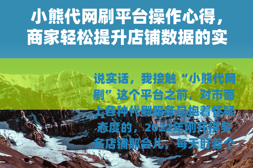 说实话,我接触“小熊代网刷”这个平台之前,对市面上各种代刷服务是抱着怀疑态度的,2022年刚开拼多多店铺那会儿,每天盯着个位数的访客发愁,身边有同行推荐说可以试试找刷单团队,但我当时第一反应就是“这玩意儿靠谱吗?会不会被平台封店?”后来实在熬不过去,抱着破罐子破摔的心态找了几个小团队试水,结果钱花了不少,效果却一塌糊涂——要么是机器刷出来的僵尸号,要么是物流信息虚假被系统秒查,直到有次逛电商论坛,看到一个老卖家分享他用“小熊代网刷”的详细流程,条理清晰,还把后台数据的截图发了出来,我才动了心思。